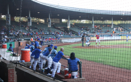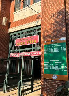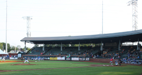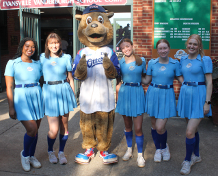 Bottom left is the Racine Belles sign at Bosse Field leftover from the filming of the movie, "A League of Their Own." Bottom center are stately old homes that have been maintained in Evansville along the Ohio River which you can see when you rollover the picture. Bottom right is the first pitch of the game from Evansville Otters' Joan Gonzalez to New York Boulders' shortstop, Austin Dennis. |